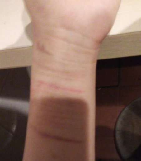 爱自残的并不是吴强一个人,还有一名陕西的刘玲玲(化名)。据刘女士介绍,她的女儿刘玲玲最近精神不大对劲,没事老是拿着硬器自残,做一些伤害自己的傻事,想请我们的专家帮忙看看,并给治疗一下。同时,刘女士还把女儿的自残后的照片传给了我们(见下图)